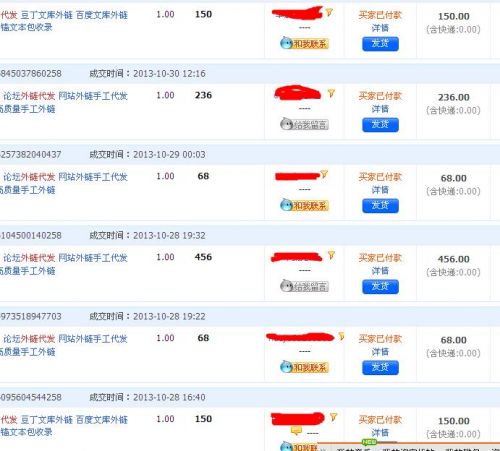 从上图可看出,我卖的这个宝贝属于服务类型的,“代发外链”,简单的说就是给别人的网站发外链,然后赚取服务费,代发外链这个市场需求是非常大的,了解过“SEO网站优化”的朋友应该非常了解。那么这个宝贝的纯利润是100%,也就是不需要任何投资。如果说需要投资,那么投的也是时间、精力。